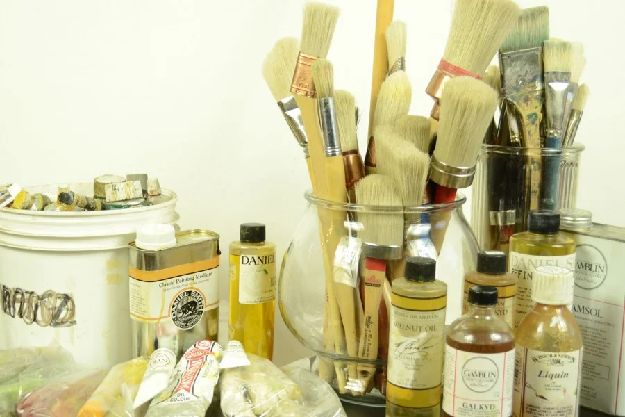 RandF oil sticks in the plastic bags are the silkiest and smoothest, lots of Paris purchaced house painting brushes shown.